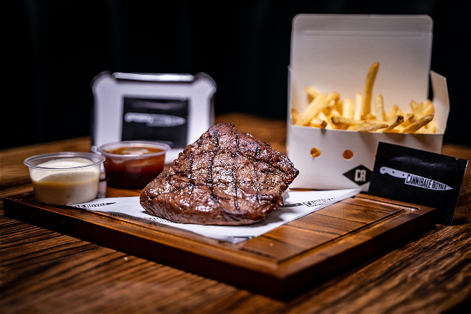 300 gram flat iron steak with bbq- and garlic sauce with French Fries and mayonnaise (served medium).